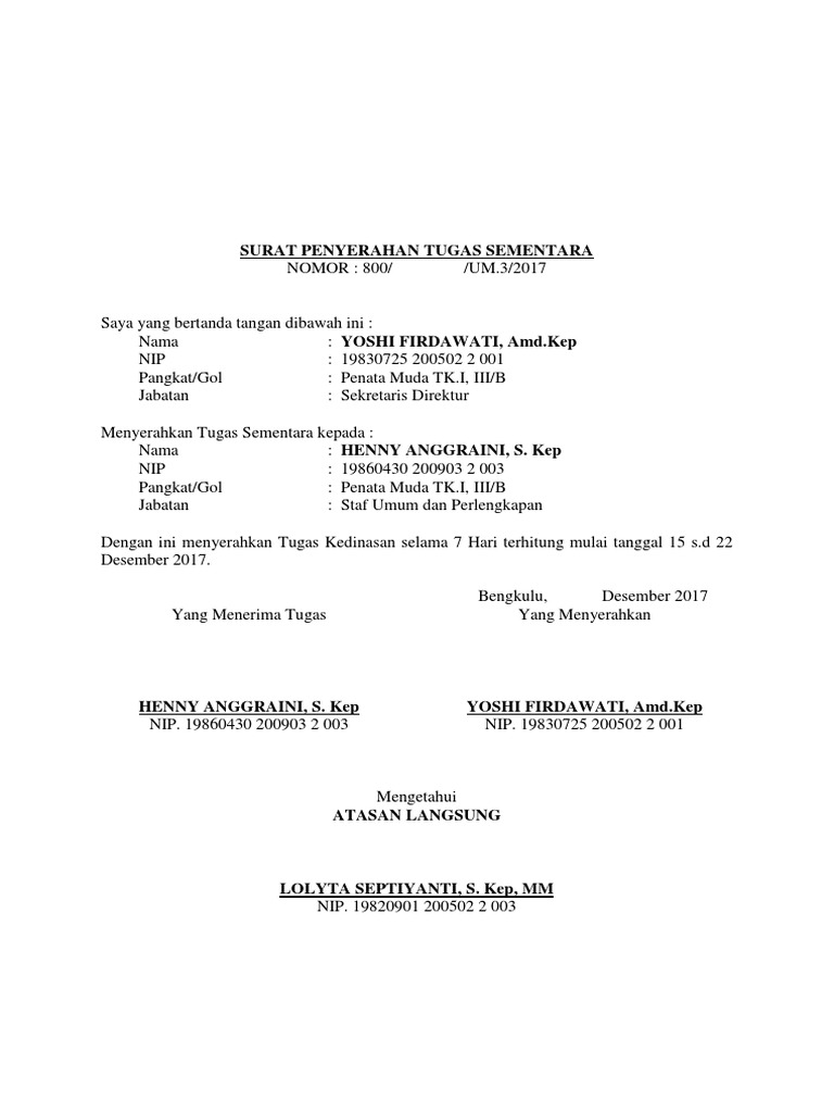 Dengan dibuatnya surat ini maka serah. Surat serahan tugas contoh surat tugas dalam artikel ini diantaranya adalah surat tugas organsisasi, surat 1 pada zaman modern, ternyata tidak mengurangi eksistensi surat. Contoh nota serah tugas 2.doc. Pantun 4 kerat ini ditulis dalam 7 rangkap. Sekiranya tugas ini dilakukan oleh pembantu am rendah, pegawai/staf yang diberikan kuasa oleh pengarah/ketua pengarah hendaklah mengawasi tugas beliau itu.